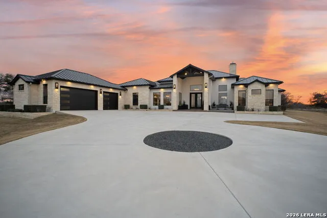 This luxurious, impeccably maintained single-story home is in the highly sought-after gated community of The Peninsula at Mystic Shores, nestled along the shores of the Guadalupe River and Canyon Lake, where water sports and neighborhood amenities abound. A grand entry welcomes you into an open-concept living space seamlessly integrating the living, kitchen, dining, and outdoor living areas-an entertainer's dream. The home features elegant ceramic tile flooring throughout, recessed lighting, quartz countertops, soaring ceilings, and stained wood beams accenting the living area, anchored by a dramatic floor-to-ceiling stone fireplace. The expansive breakfast bar with stone surround serves as the centerpiece for gatherings, while the chef's kitchen is equipped with stainless steel appliances, gas cooktop, double ovens, pot filler, and a convenient window pass-through to the outdoor bar. Outdoor living is exceptional, offering stained concrete flooring, a floor-to-ceiling stone fireplace, stone-enclosed outdoor kitchen, shiplap ceiling, ceiling fan, and a surround-sound system-perfect for year-round enjoyment. The primary suite is a true sanctuary, featuring a spa-like bath and a large walk-in closet with direct access to the oversized utility room, complete with its own dog spa. A fifth bedroom, located opposite the primary suite, is currently utilized as a fully equipped fitness room and would also make an ideal private study. The opposite wing of the home includes a spacious guest suite with an ensuite bath, along with two additional bedrooms connected by a well-appointed Jack-and-Jill bath, each offering walk-in closets. This home shows like a meticulously appointed model, offering effortless living, exceptional entertaining spaces, and an incredible Hill Country location. With access to outstanding amenities and serene surroundings, this private retreat invites you to make 146 Obscure Way your private retreat.